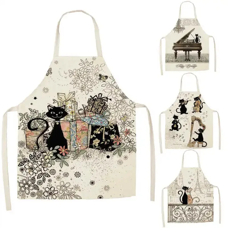 Home Cute Cat Pattern Kitchen Apron Women’s Cotton Linen Bib Home Cleaning Apron Home Cooking Bib